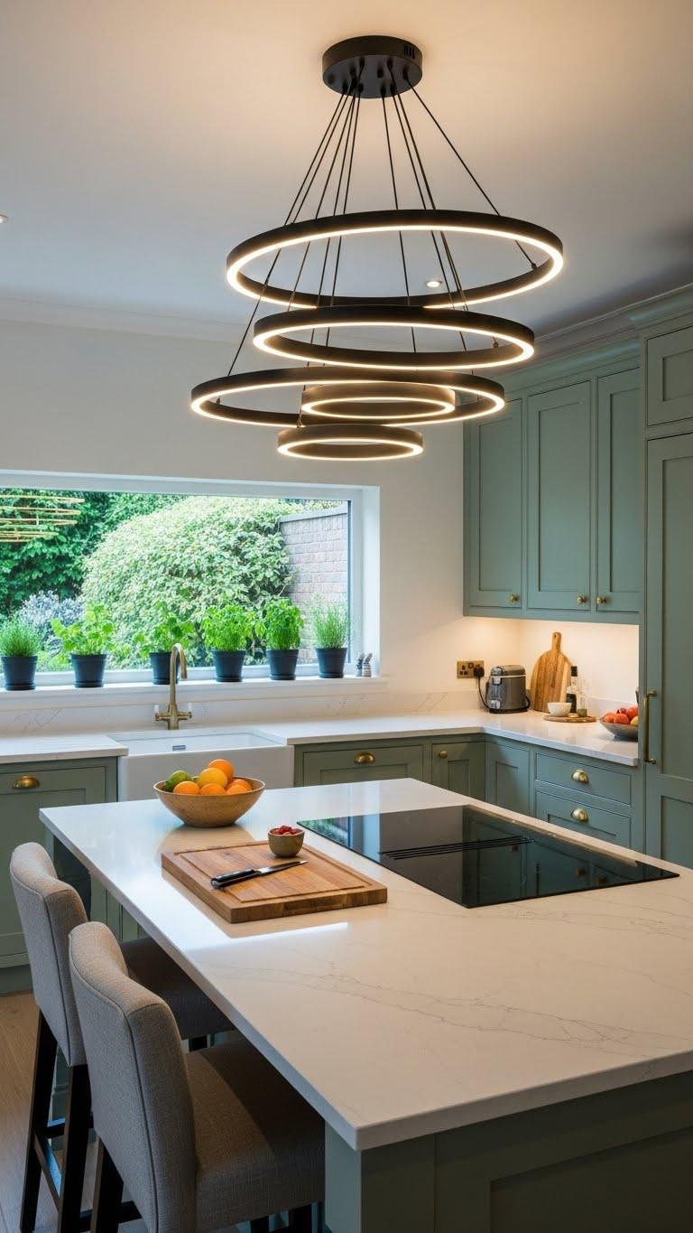 After freshening cabinets with green paint, bring the look together by hanging a bold fixture over the island—lighting is a design anchor that defines the room’s mood and scale. Choose oversized pendants or a statement chandelier to create focus and freedom to personalize brightness and finish.