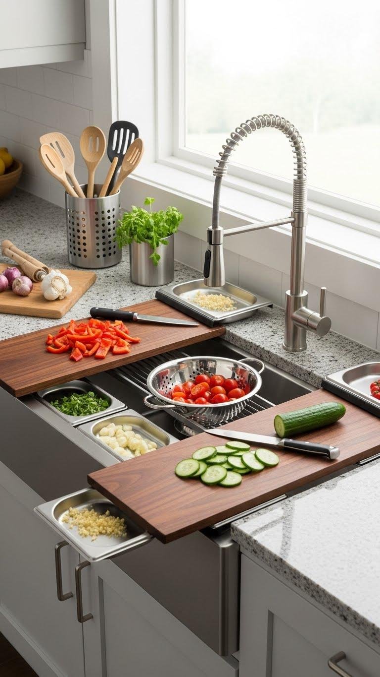 Tuck your sink into a multifunctional hub that streamlines prep and serving: choose models with built-in cutting boards, colanders, and removable trays so you can chop, rinse, and plate right over the basin.
