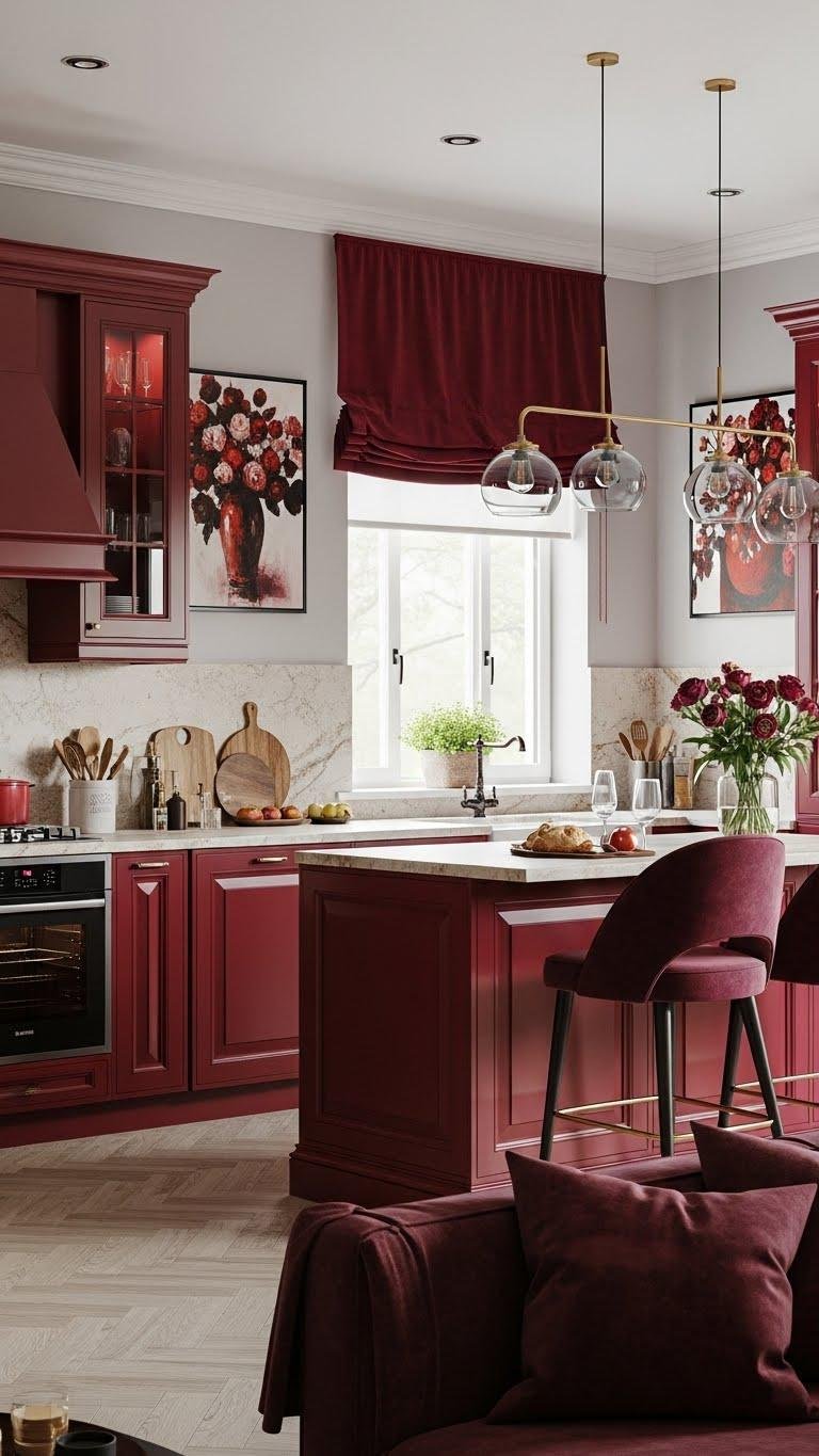You’ll add deep crimson touches via cabinetry trim, barstools, or artwork, pairing them with velvet accents on cushions or window treatments.