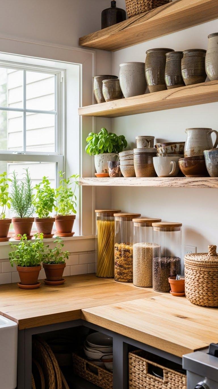 Bring in live edge shelving to display ceramics and create tactile contrast, and set an indoor herb garden on a sunny sill for scent and fresh flavor.