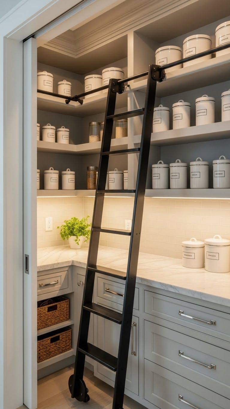 You’ll love a hidden pantry behind a pocket door, neat shelves with labeled canisters, task lighting, and a rolling ladder for high shelves—freedom to organize, prep, and hide the mess.