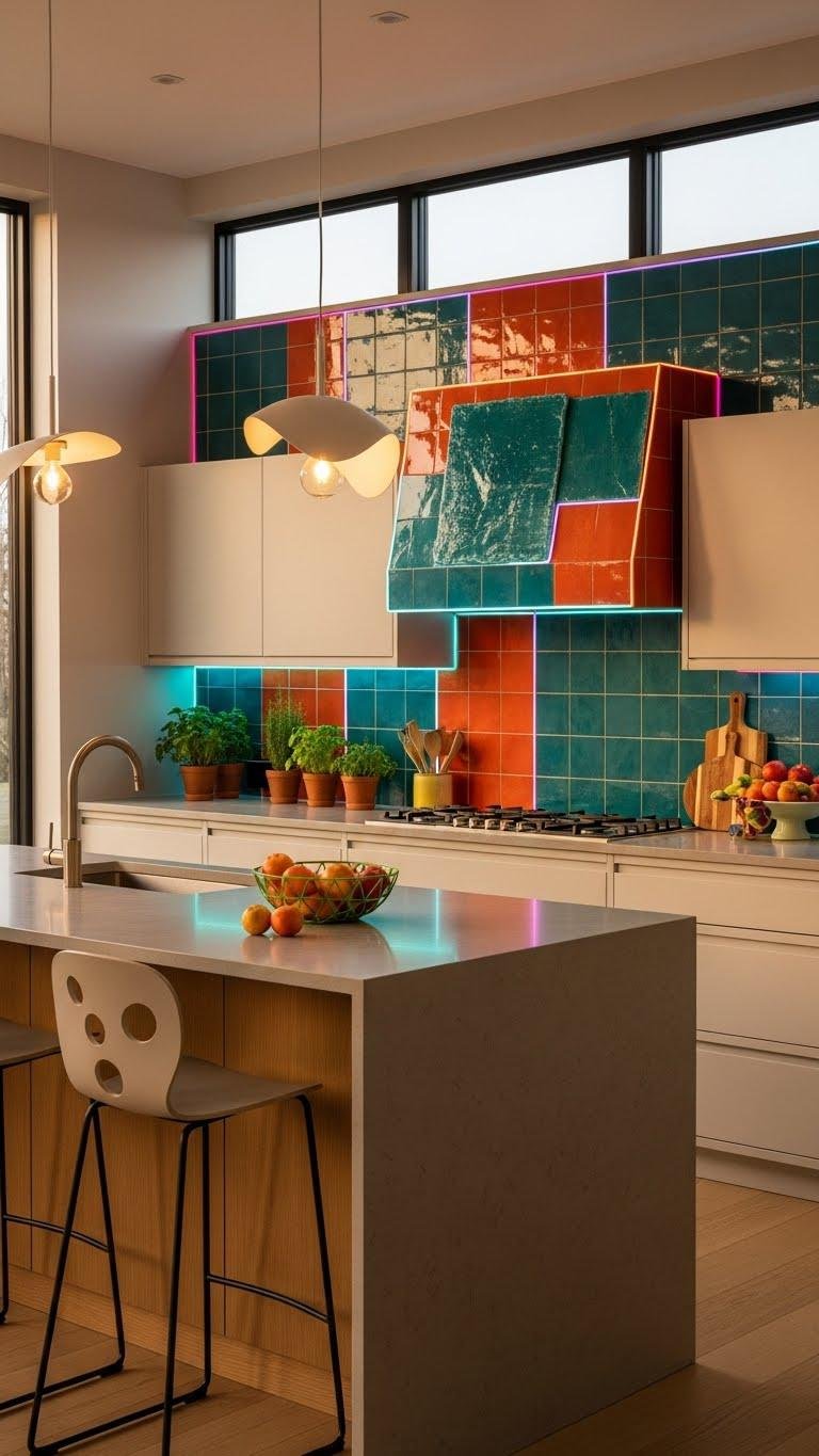 Kick up your kitchen’s personality by swapping in a bold-colored backsplash that anchors the space and draws the eye. Choose hand painted tiles for artisan texture or large slabs for modern drama. Pick a liberated hue that reflects you, then finish edges with neon grout for a playful pop.
