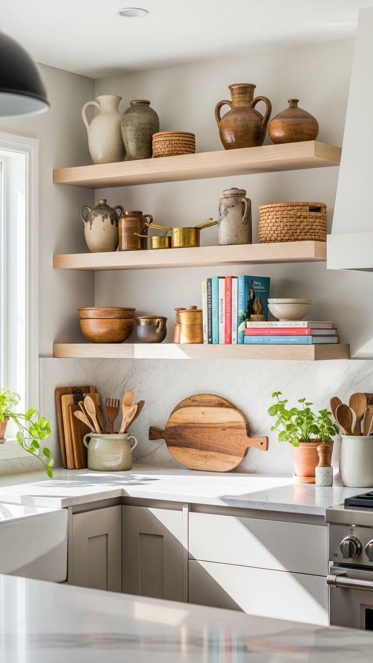 You’ll choose floating shelves that suit your rhythm, mix ceramics styling with practical pieces, and craft a tidy cookbook display. This lets you personalize, breathe easier, and grab essentials without fuss.