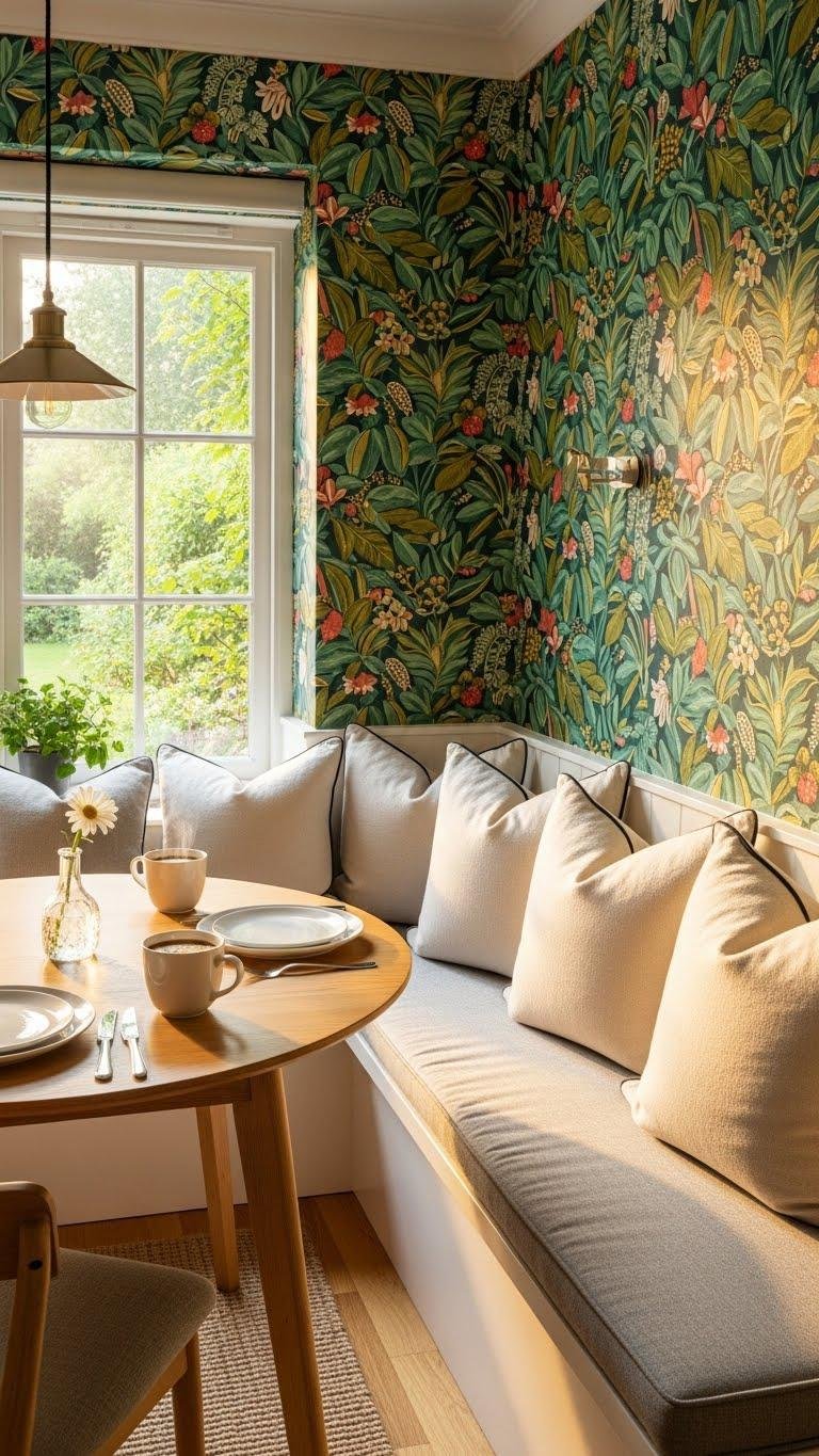 Wallpaper can instantly define a breakfast nook and give a small corner personality without major renovation. Choose bold pattern pairing to set mood, then balance with neutral textiles. You’ll create a curated focal point that feels liberated and intentional.