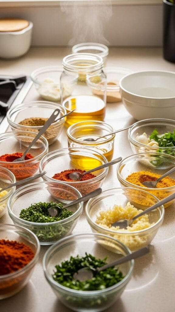 Lining up bowls, jars, and spoons before you start gives the whole cooking process a calm, efficient beat: you’ll see amounts at a glance, grab what you need without pausing, and keep your work surface cleaner.
