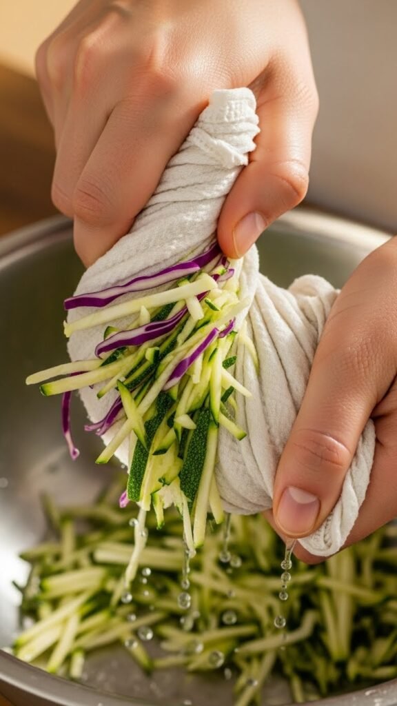 Lay shredded cabbage or zucchini in a clean cloth, practice microfiber squeezing for firm pressure, or try cheesecloth pressing for gentle release.