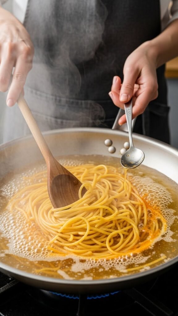 You’ll feel steam kiss your wrists as noodles soften fast; the shallow pan technique promotes quick water absorption and even coating, so you move freely, tasting and finishing pasta perfectly.