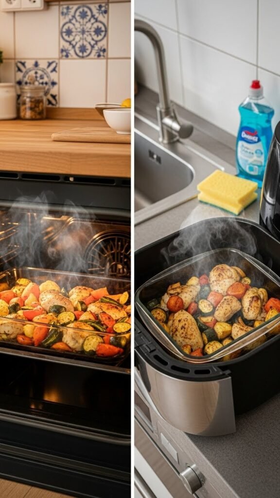 Slide a glass baking dish into your oven or air fryer and you’ll notice food cooks more evenly and often a bit faster than in metal—glass holds and radiates heat, so edges brown gently while centers come up to temperature without sudden hot spots.