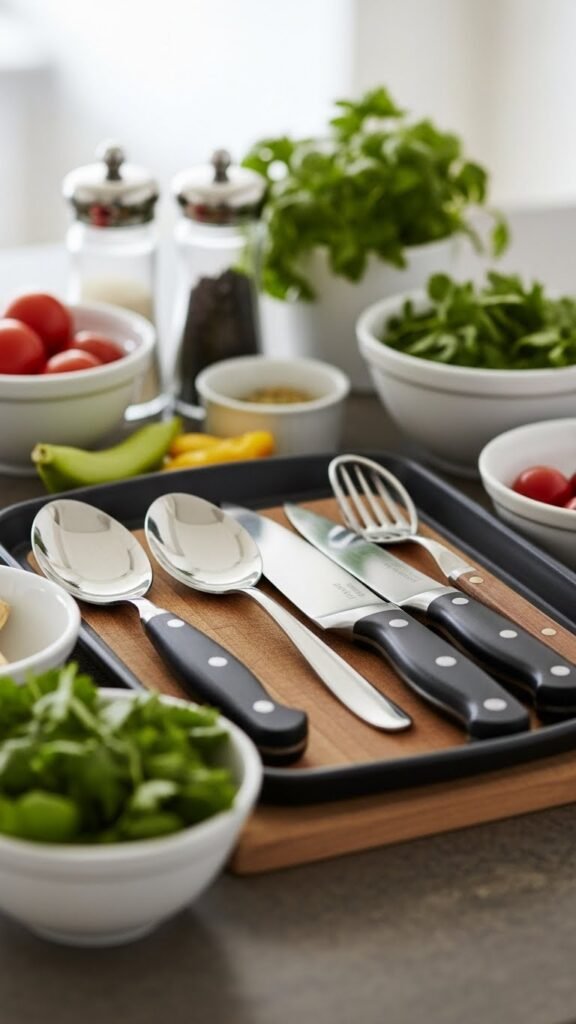 If labeling keeps your fridge calm, corralling every tool for a recipe on a single tray or cutting board brings that same order to your countertop. You’ll set a tidy tray assembly: spoons, knives, bowls, and aromatics arranged like a mini mise en place.