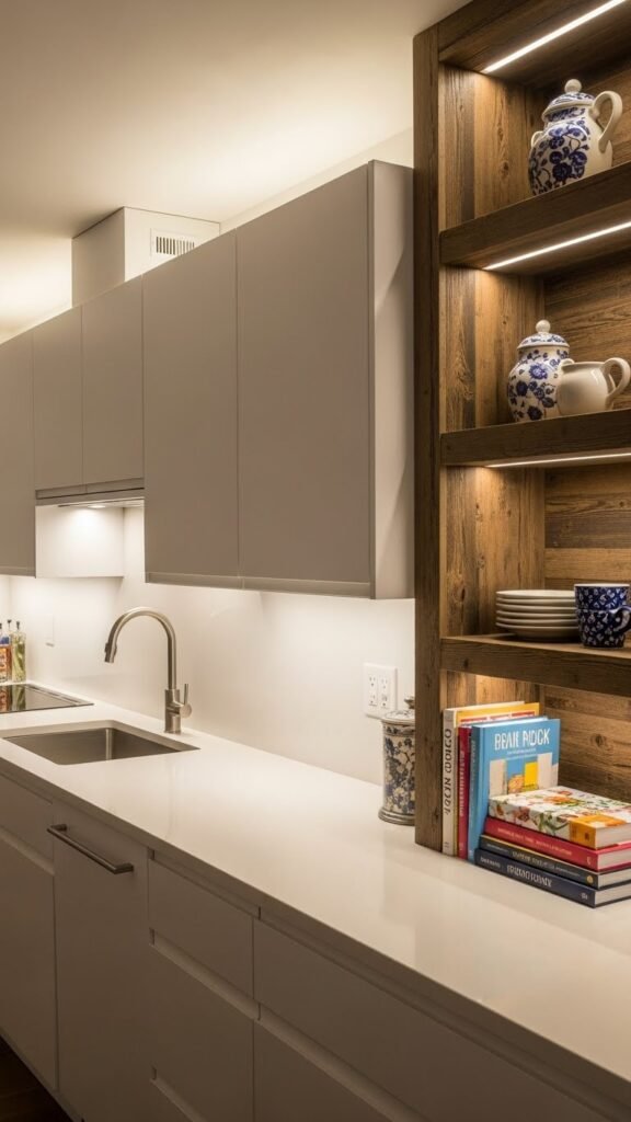 Under-cabinet LED strips give your kitchen and shelving a clean, functional glow that feels both modern and hospitable.