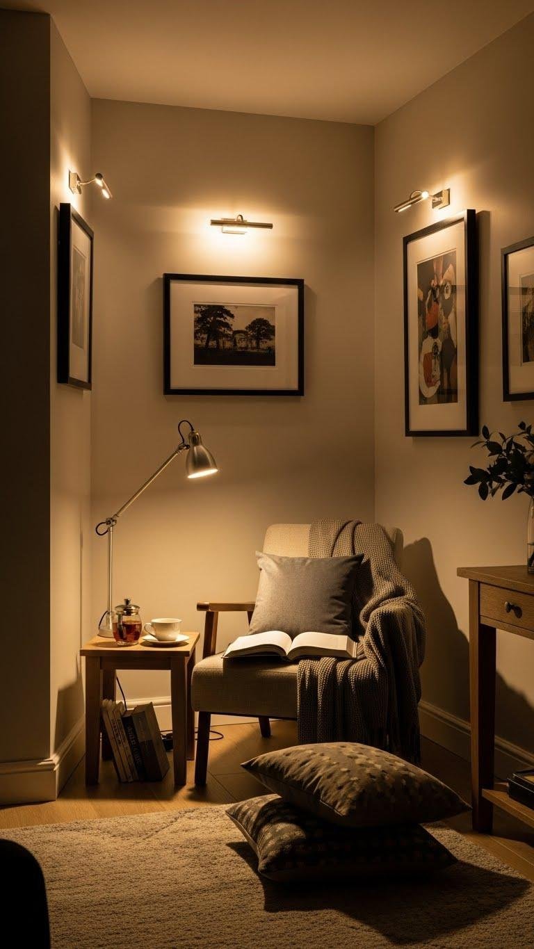 Once your work and reading areas are well lit, bring the same care to the walls where your art lives: adjustable accent lights let you sculpt mood and draw attention to pieces without overpowering the room.