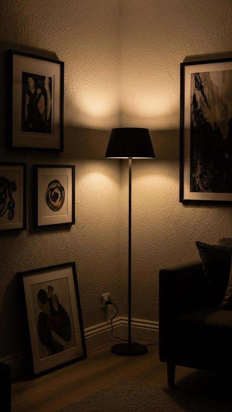 Want to banish those shadowy corners without rewiring a thing? Place a tall floor lamp with a slim profile to throw corner uplighting upward, softening edges and freeing the room.
