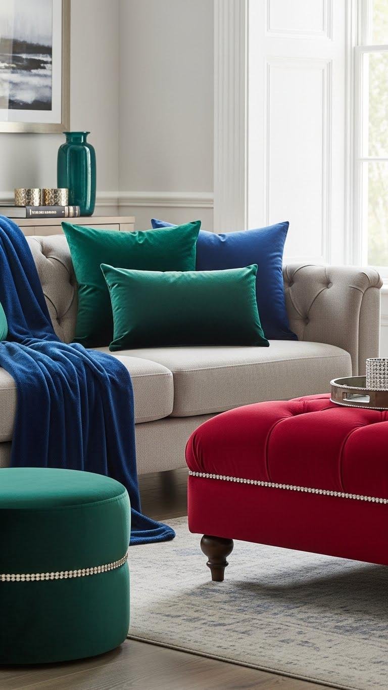 When you introduce jewel-tone accents—think emerald pillows, sapphire throws, or a ruby ottoman—you instantly elevate the room with rich color and depth without overhauling your whole scheme.