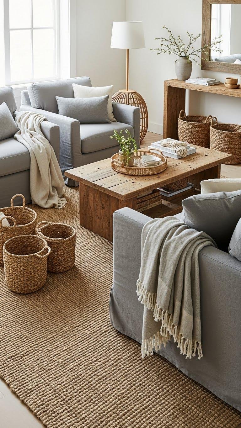 Because texture grounds a room, layer natural materials like jute rugs, linen slipcovers, and reclaimed-wood surfaces to add warmth and tactile interest without cluttering the palette. You’ll mix woven seagrass baskets, rattan accents, and linen throws for contrast, keeping colors muted and curated. Let materials dictate rhythm—vary scale and sheen so the space feels open, relaxed, and intentionally free.