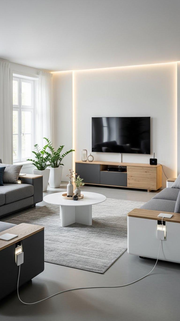 Tuck charging and tech into your living room so power is always there but never in the way. You’ll hide cords in furniture channels, integrate hidden ports in consoles and side tables, and place wireless hubs behind media units for seamless connectivity.