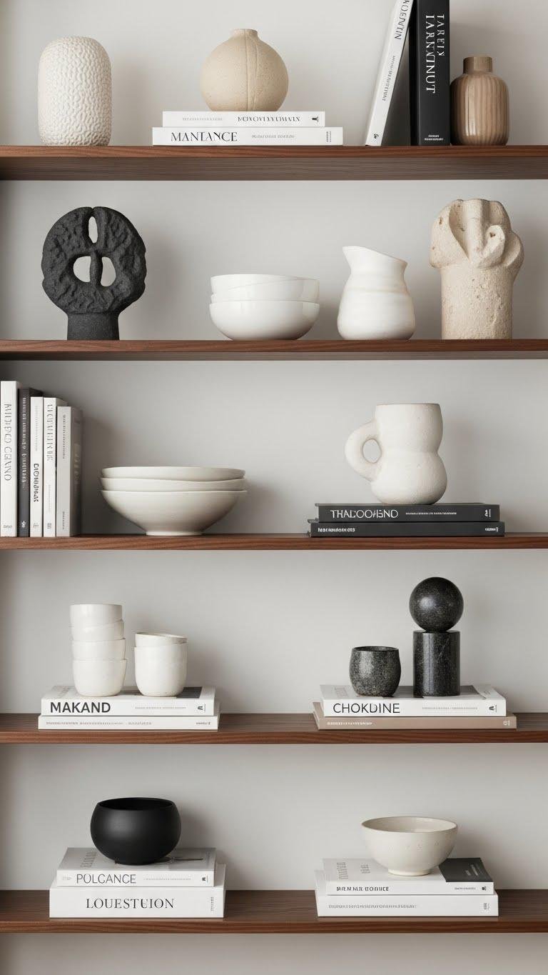 You’ll curate objects by scale and purpose, using color blocking to guide the eye and texture contrast to add depth. Mix ceramics, books, and sculptural pieces, leaving breathing room so each item feels chosen, not cluttered — a liberated, refined display.