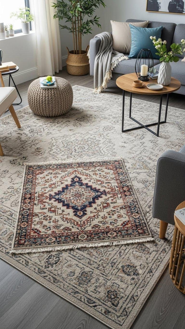 Mix rugs to build depth and guide the eye across your space—start with a large, neutral foundation rug and add a smaller, patterned or textured rug offset on top to define seating zones and introduce contrast.