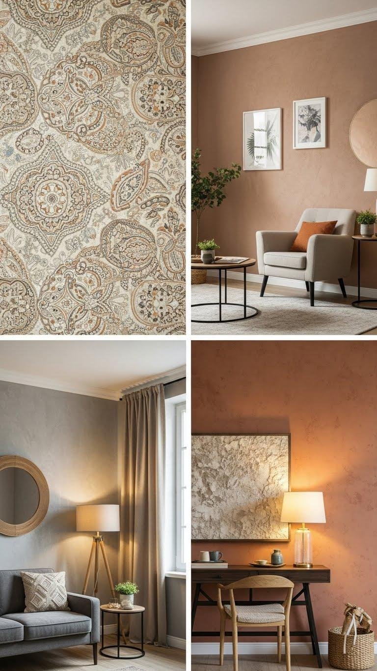 Choose textured wallpapers for patterned drama or subtle clay plaster for earthy sophistication.