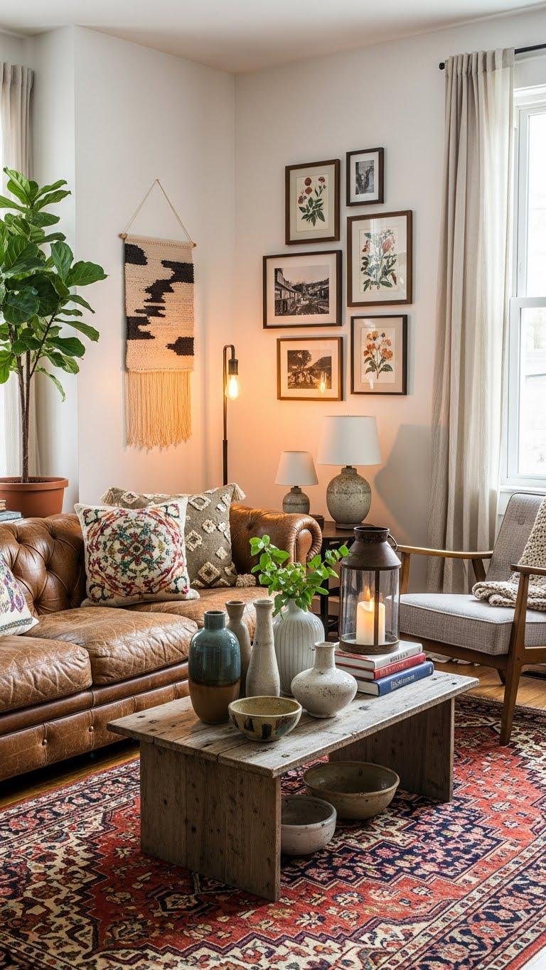 You’ll scout artisan markets and seek reclaimed finds to layer texture and story, mixing ceramics, worn leather, or a woven rug that feels personal yet polished, giving your living room liberated, curated character.