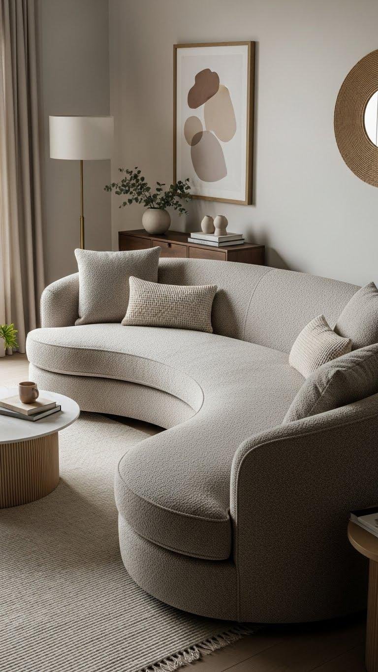 Bring in a curved sofa to soften the room’s geometry and invite lingered conversation; its sweeping silhouette breaks up straight lines and creates a natural focal point without shouting for attention. Choose a curved silhouette with plush upholstery and a rounded chaise to encourage relaxed lounging.