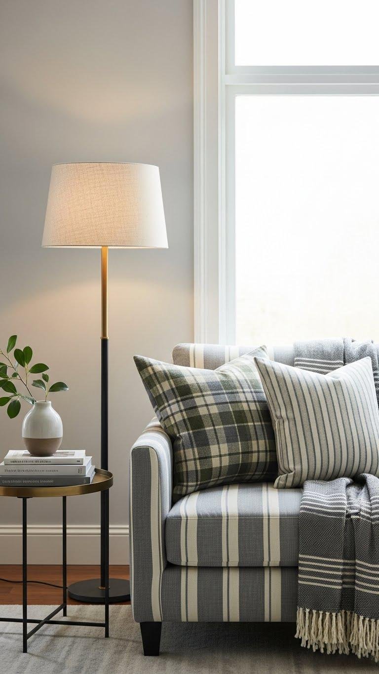 You’ll balance scale and color: pick one dominant plaid layering piece and introduce stripe pairing in smaller accents like pillows or a runner.