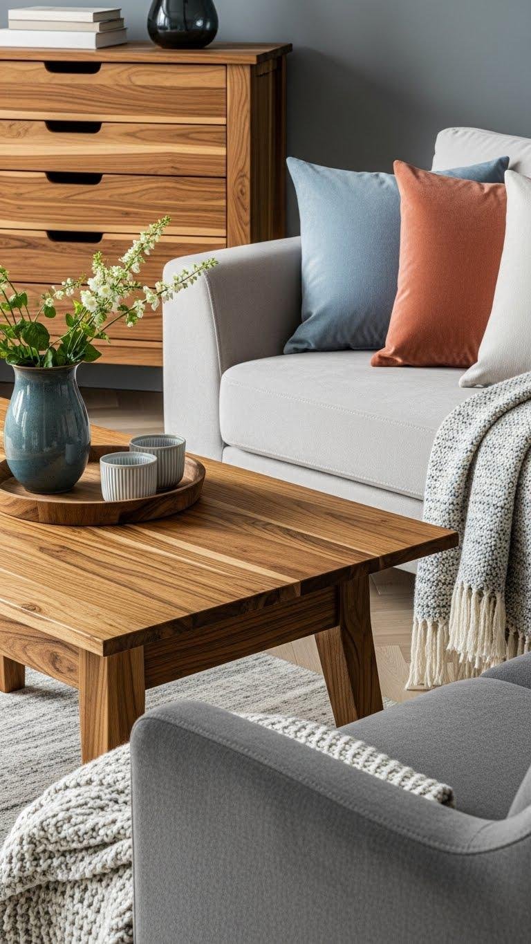 Bring out the best in your wood pieces by contrasting their grain with fabrics that sing against them—think cool linens, velvet tufting, or nubby wools that set off the wood’s tone and texture.