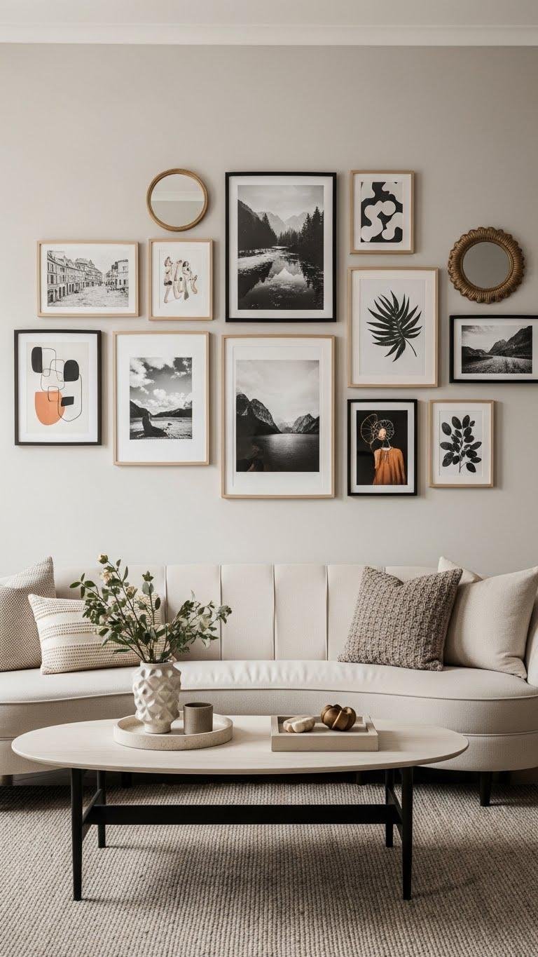 A curved sofa sets a soft, inviting stage—now let your walls answer with personality by arranging a gallery of mixed frames that balances shape and scale.
