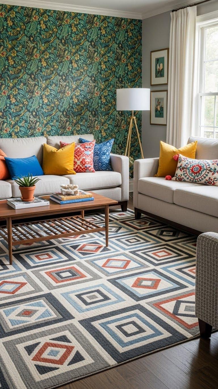 Don’t be afraid to layer bold patterns—you’ll instantly inject energy and personality into a living room without sacrificing cohesion. Mix a statement bold wallpaper with neutral furnishings, then echo its palette through patterned throw pillows and a geometric rug.