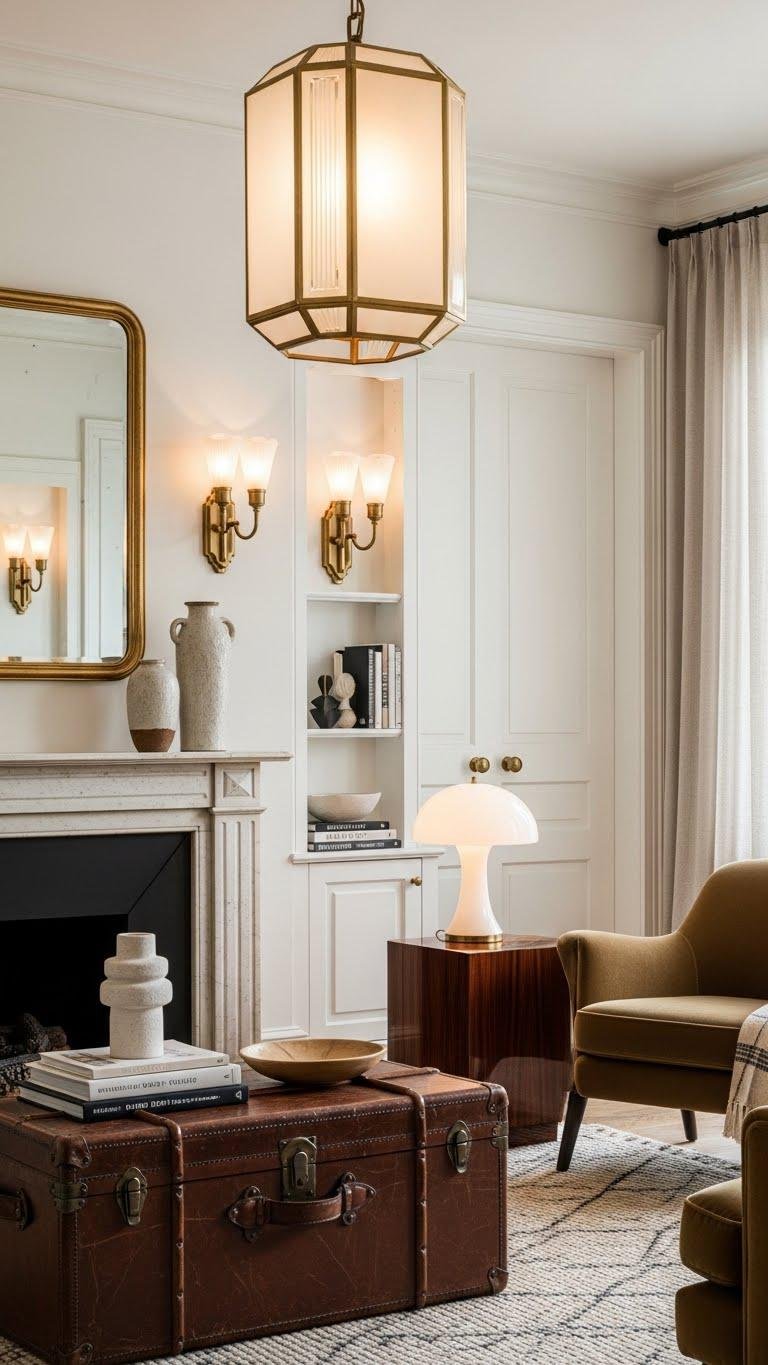 Bring in vintage or Art Deco lighting to give the room a layered, characterful glow that reads as both timeless and on-trend. You’ll mix statement pendants, brass sconces and delicate shades that echo antique glassware, creating curated warmth and sculptural interest.