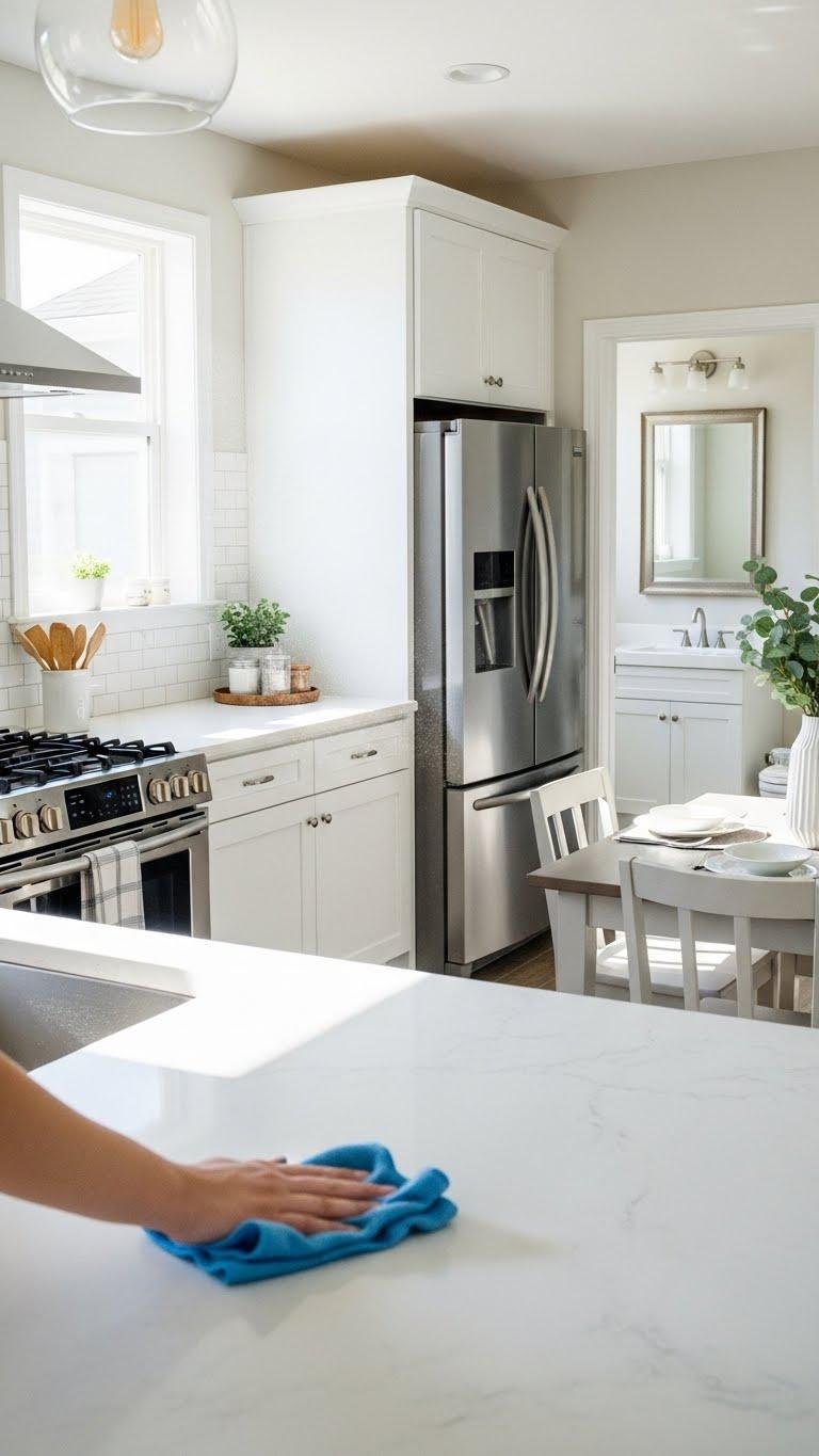 Set a simple surface rotation—kitchen counters, stove, dining table, bathroom sink—so you don’t overthink it. Stick to this short habit and reclaim time without sacrificing a tidy space.
