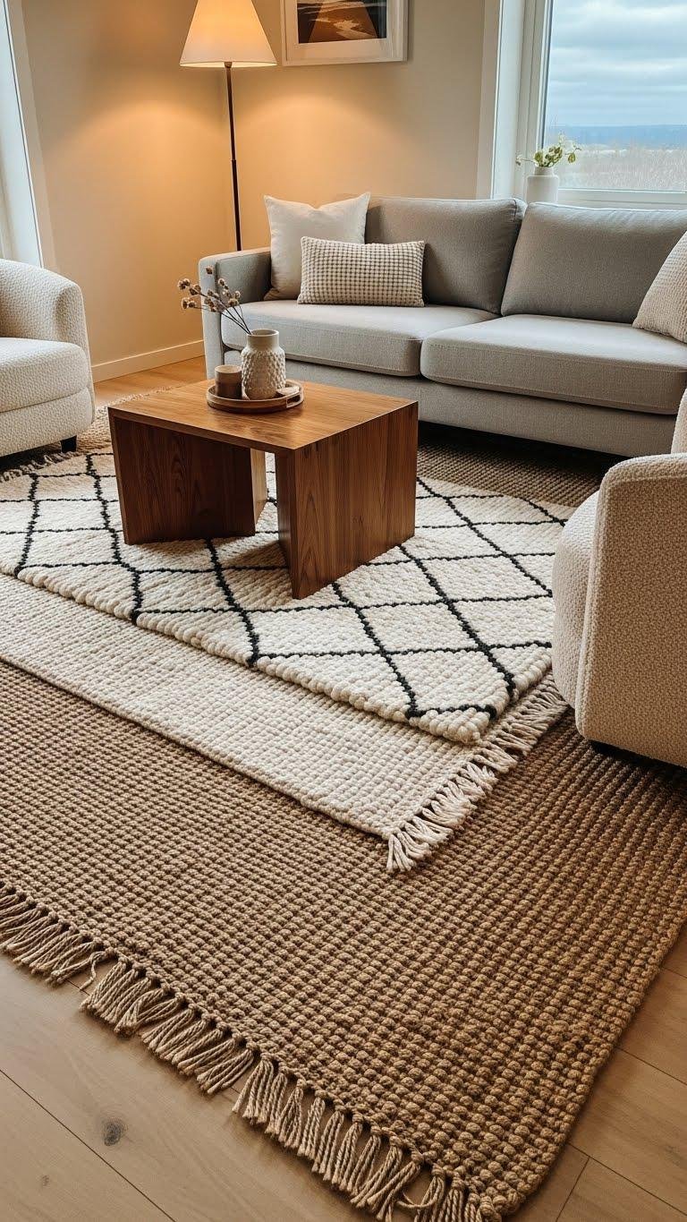 By layering rugs, you create defined zones and a softer underfoot feel without cluttering the room; start with a large, neutral base and add a smaller textured or patterned piece to anchor seating or a bed.
