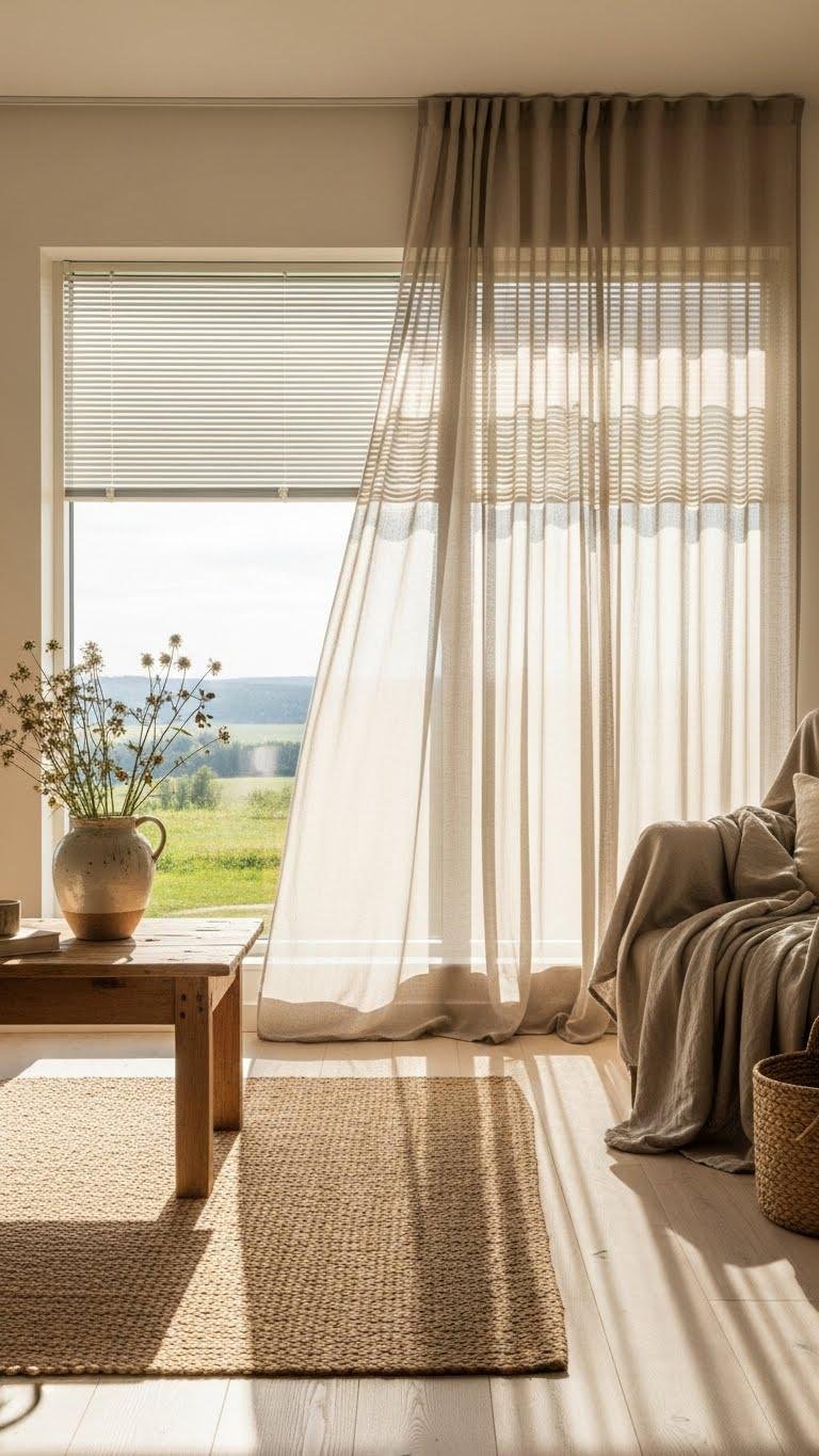 You’ll favor sheer panels for gentle diffusion, pair them with low-profile solar blinds for glare control, and keep hardware minimal. Aim for layered, movable treatments that let you live freely in light.