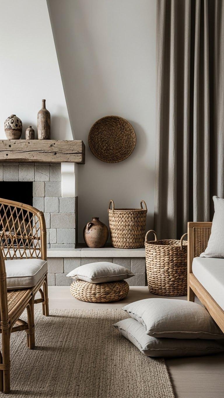 Mix in natural materials to give your minimalist scheme warmth and tactile depth—think woven rattan, weathered wood, linen, and stone paired across the room. Balance reclaimed teak accents with woven seagrass baskets, choose raw linen cushions and curtains, and add a stoneware tile hearth or splashback. You’ll create a calm, liberated space that feels lived-in without clutter.