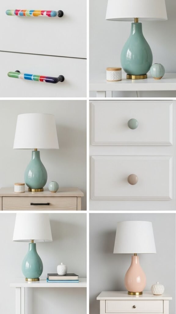 Several small updates can change a room’s personality overnight: swap plain drawer pulls for painted knobs, refresh lamp bases with a matching accent color, and add tiny metallic or ceramic details that tie the palette together.