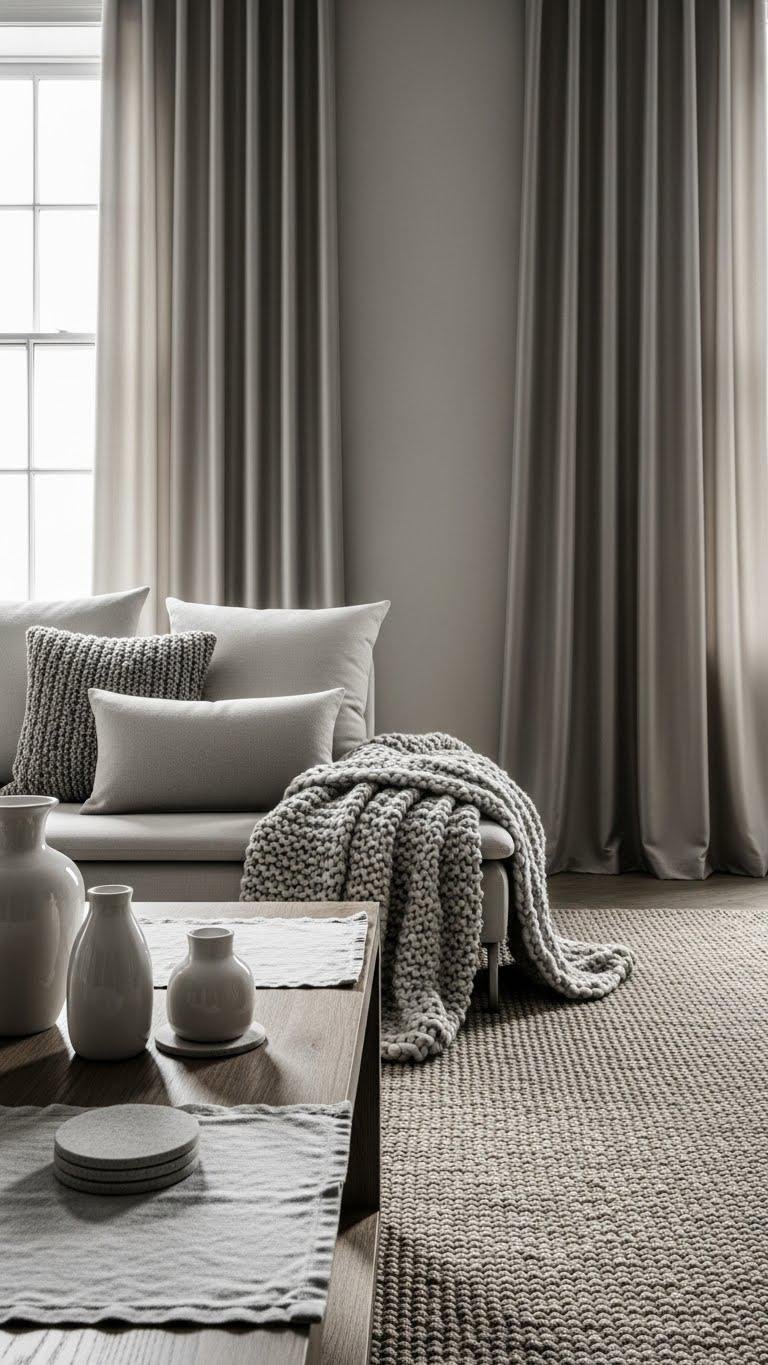 You’ll use tone layering to create depth: matte walls, satin curtains, boucle pillows, woven rugs.