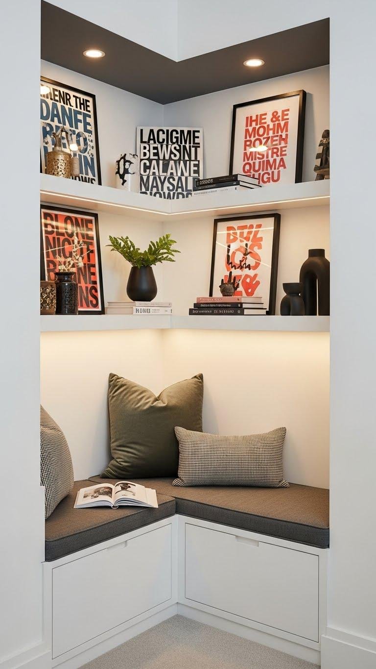 You’ll plan Alcove lighting to highlight objects, stagger shelf depths for flow, and integrate Corner seating nearby for cozy nooks. Choose open and closed storage, paint the recess for contrast, and keep styling spare.