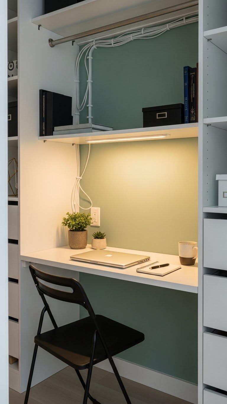 When you reclaim that unused closet, you get a compact, distraction-free workspace that fits neatly into your daily routine. Convert shelves into a slim compact desk, mount focused lighting, and add a folding chair. Wire neatly, use hidden storage for supplies, and paint a calming accent.