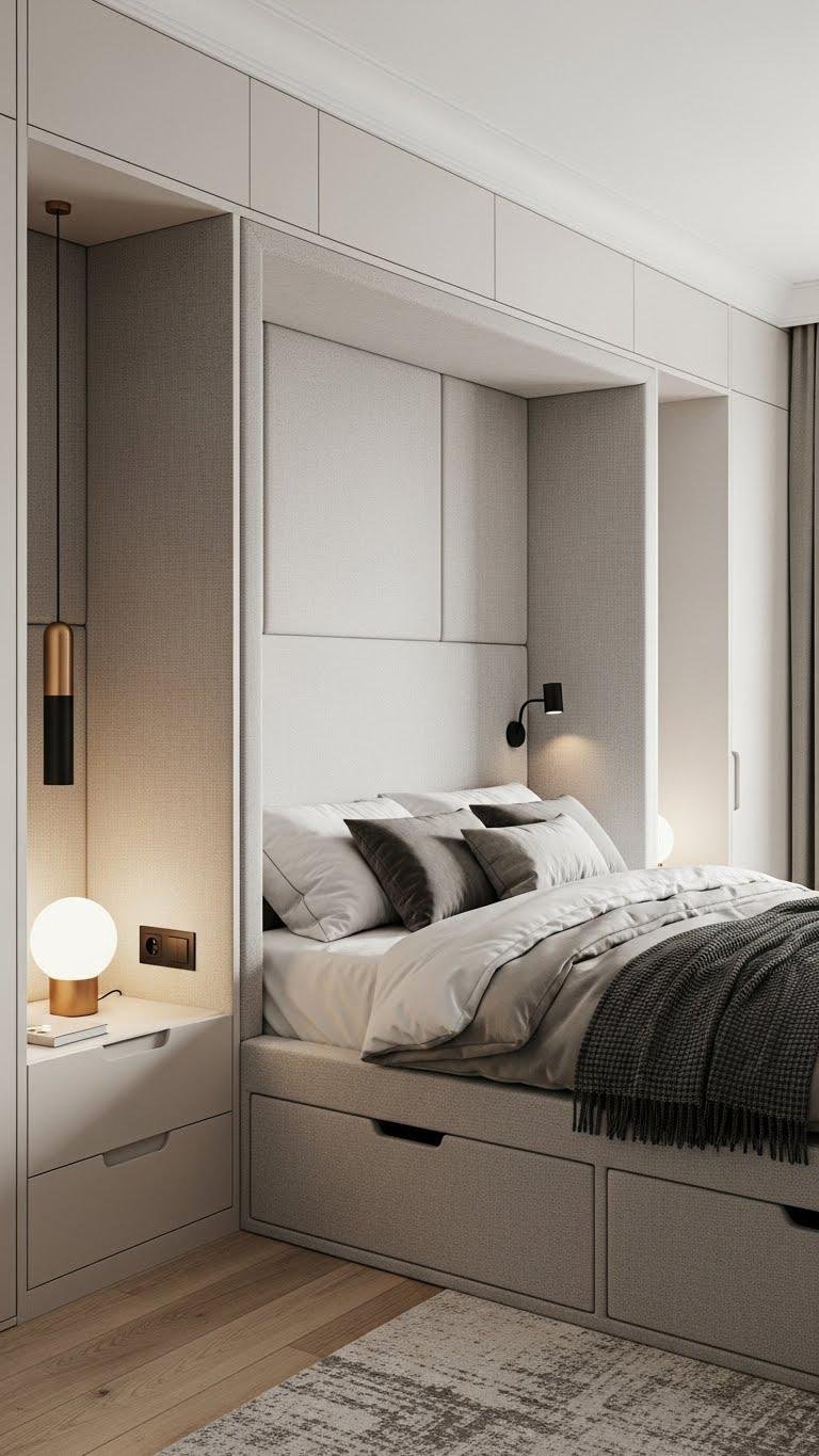 Framing the bed with a wall-to-wall extended headboard instantly anchors the room and gives you a built-in sense of structure and scale. You’ll craft a padded alcove for lounging, tuck storage beneath, and choose seamless upholstery to keep lines clean.