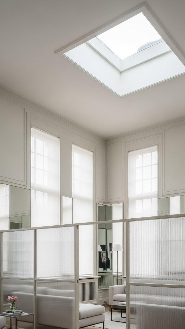 Balance skylight placement with translucent partitions to channel sun, define zones, and keep sightlines open so you move freely in luminous, minimal spaces.
