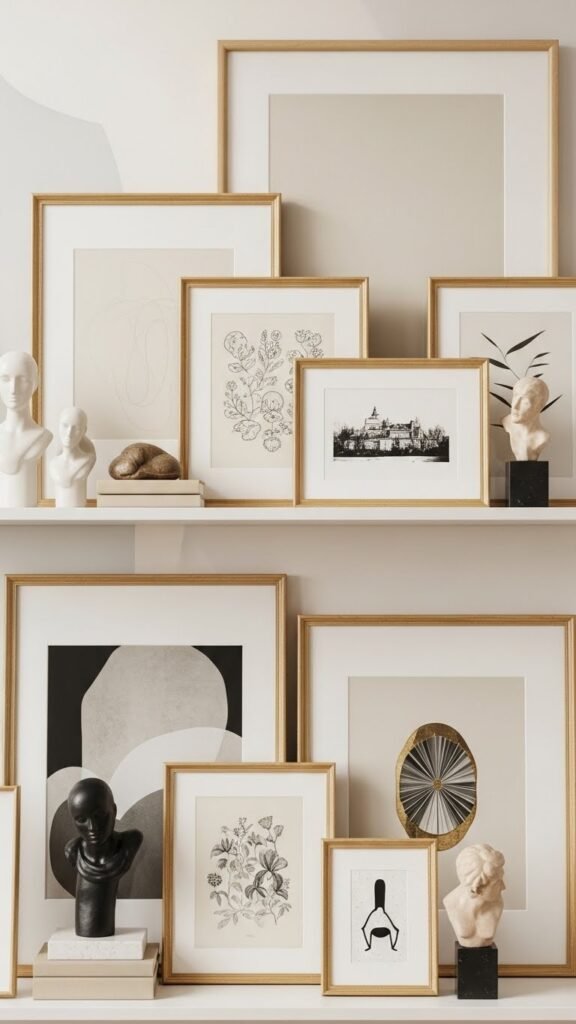 When you mix framed prints with small sculptures, stagger them vertically and horizontally so each piece gets its own breathing room and the eye moves across the shelf like a curated gallery.