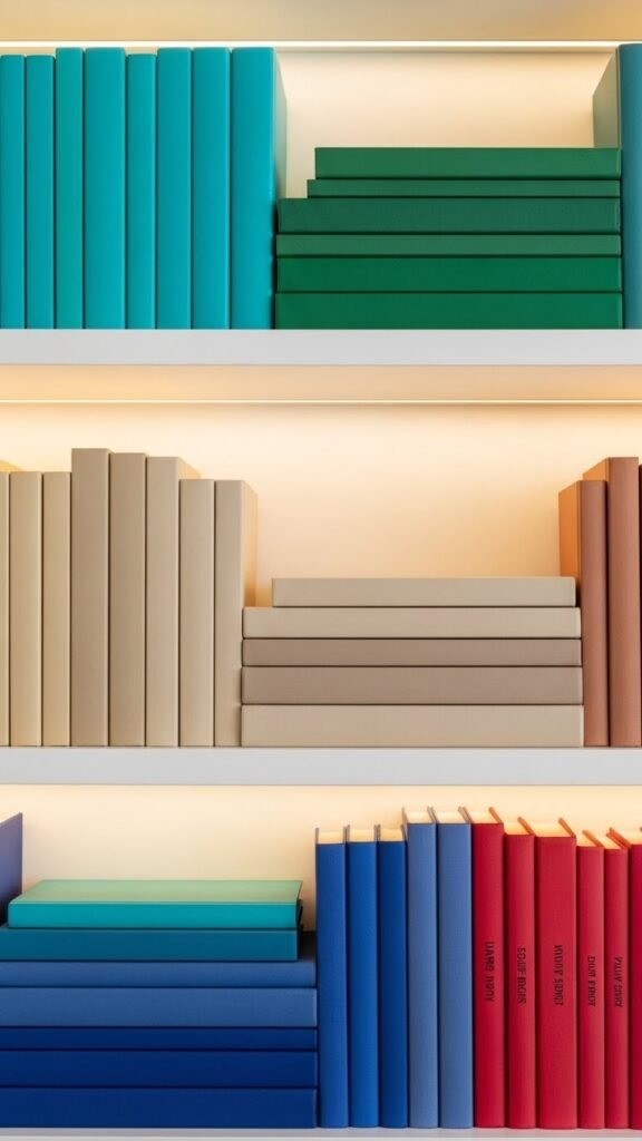 You’ll arrange paperback stacks and hardcovers into a deliberate color gradient, mixing heights and textures so each block feels curated, free, and modern.