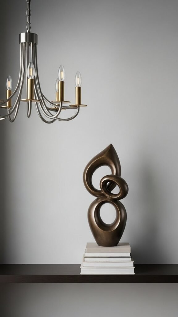 You’ll balance an oversized sculpture with negative space, lean into scale by pairing low-profile books, and let a statement chandelier nearby echo curves or metallics.