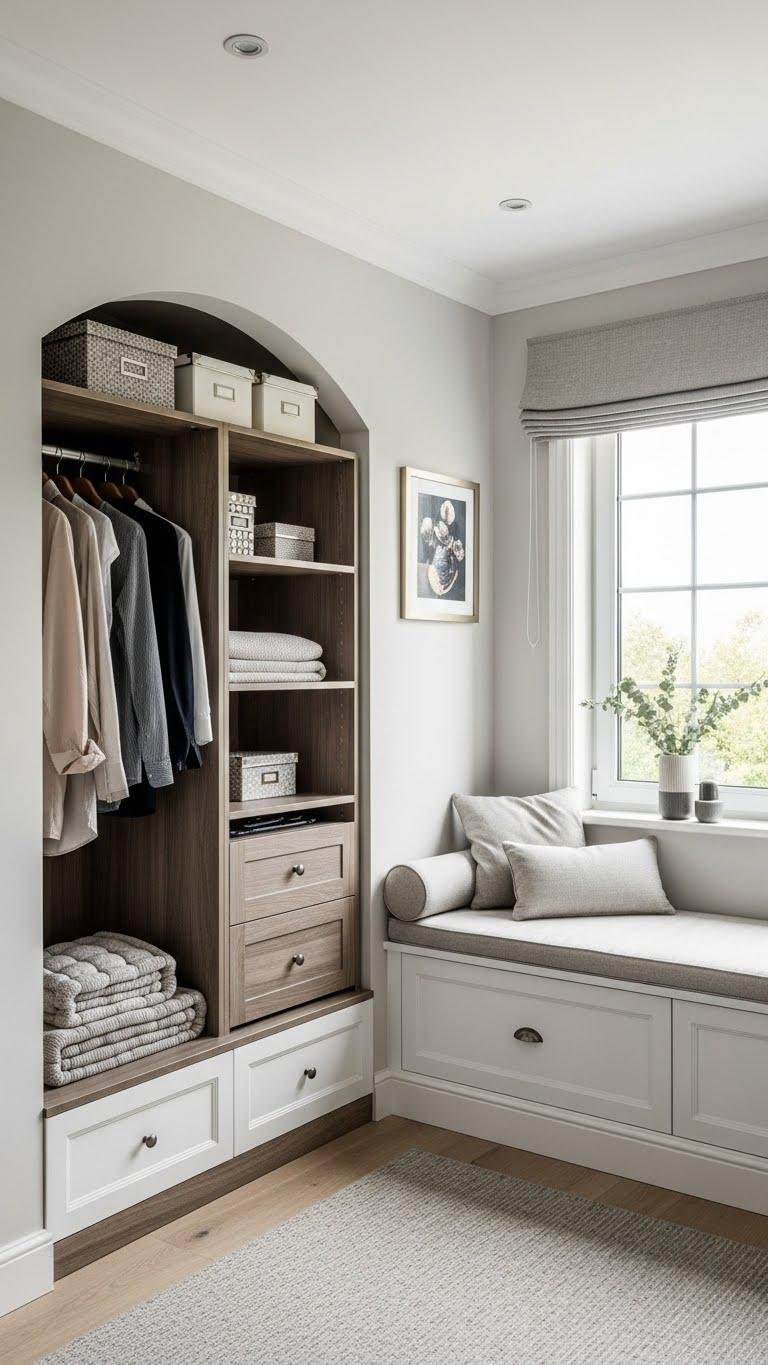 Turn that awkward niche into useful storage by fitting it with custom shelving or a slim built-in closet that matches your room’s proportions and style. You’ll gain neat display space, hidden drawers, or a compact wardrobe.