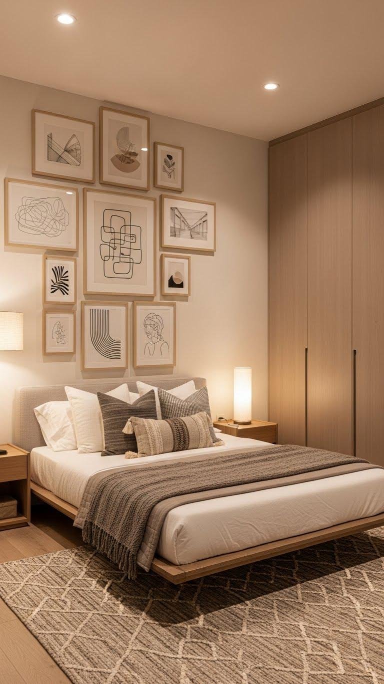 Create a vertical gallery beside the bed or closet, using stacked frames to keep proportions neat. You’ll free visual space while asserting a clean, elevated look.