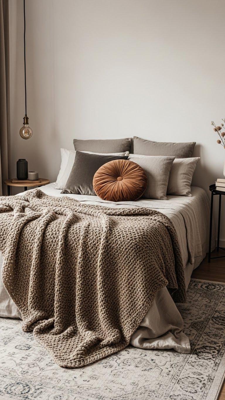 Layer in tactile elements to make a small bedroom feel cozy without cluttering it: mix a chunky knit throw, a couple of velvet or linen cushions, and a soft area rug to define the bed zone and add warmth underfoot.