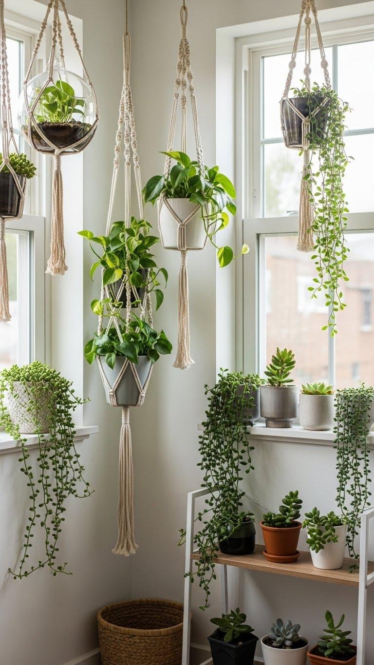 Add Plants With Hanging Planters or Shelf Displays