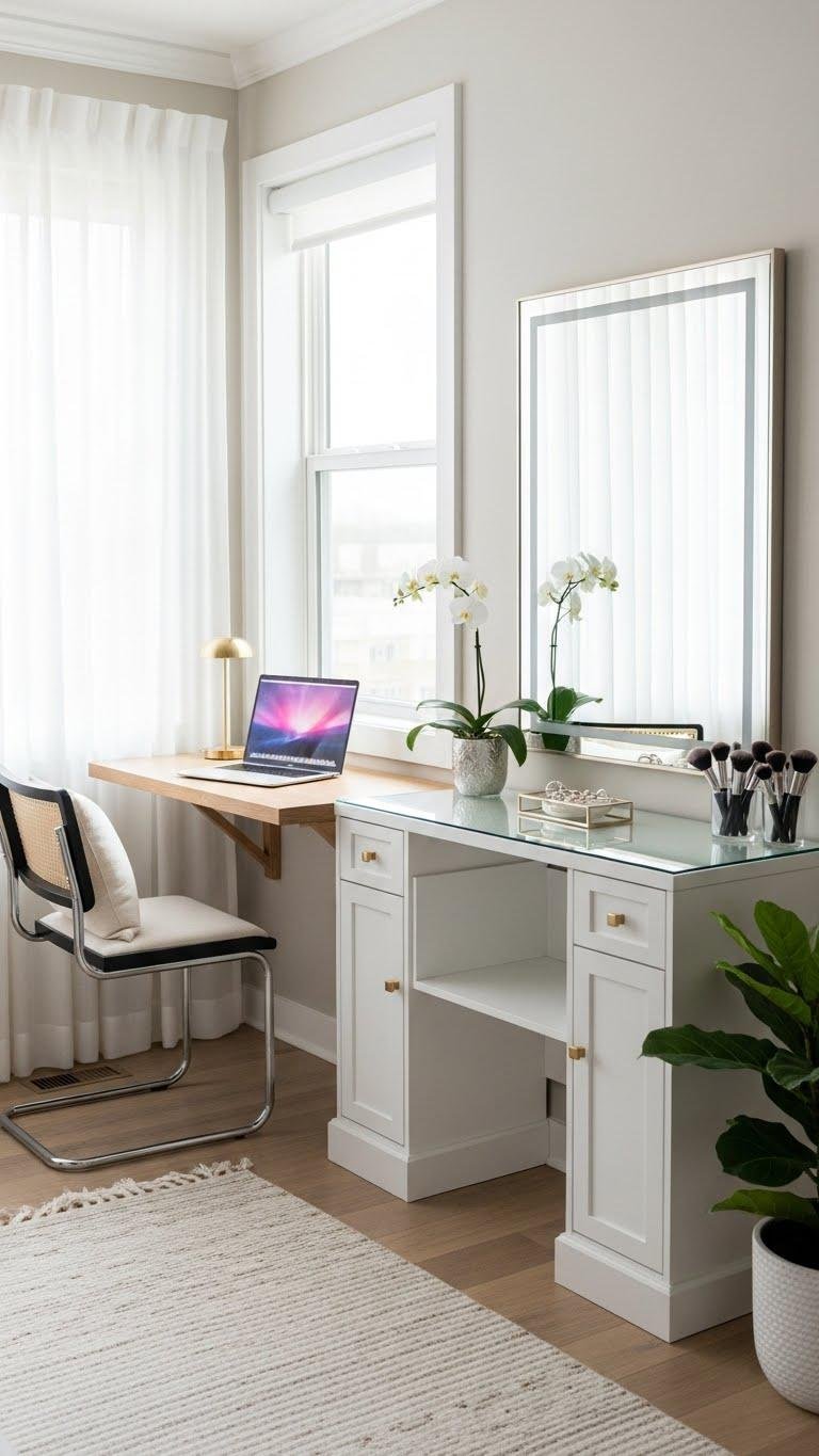 Carve out a purpose for that unused corner with a compact desk or vanity that fits your routine and maximizes floor space. Choose a slim, wall-mounted compact workspace or a mirrored vanity with storage to keep surfaces clear.