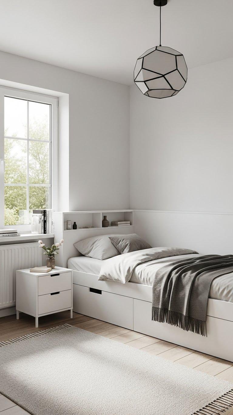 Tuck your bed against a wall or into a corner to instantly open up floor space and create a focused sleeping zone; this layout lets you move freely, add a small night surface, or fit a dresser without crowding the room.