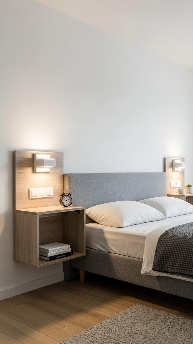 When floor space is at a premium, swap bulky nightstands for wall‑mounted or floating tables to free up visual and actual room while keeping essentials within reach.