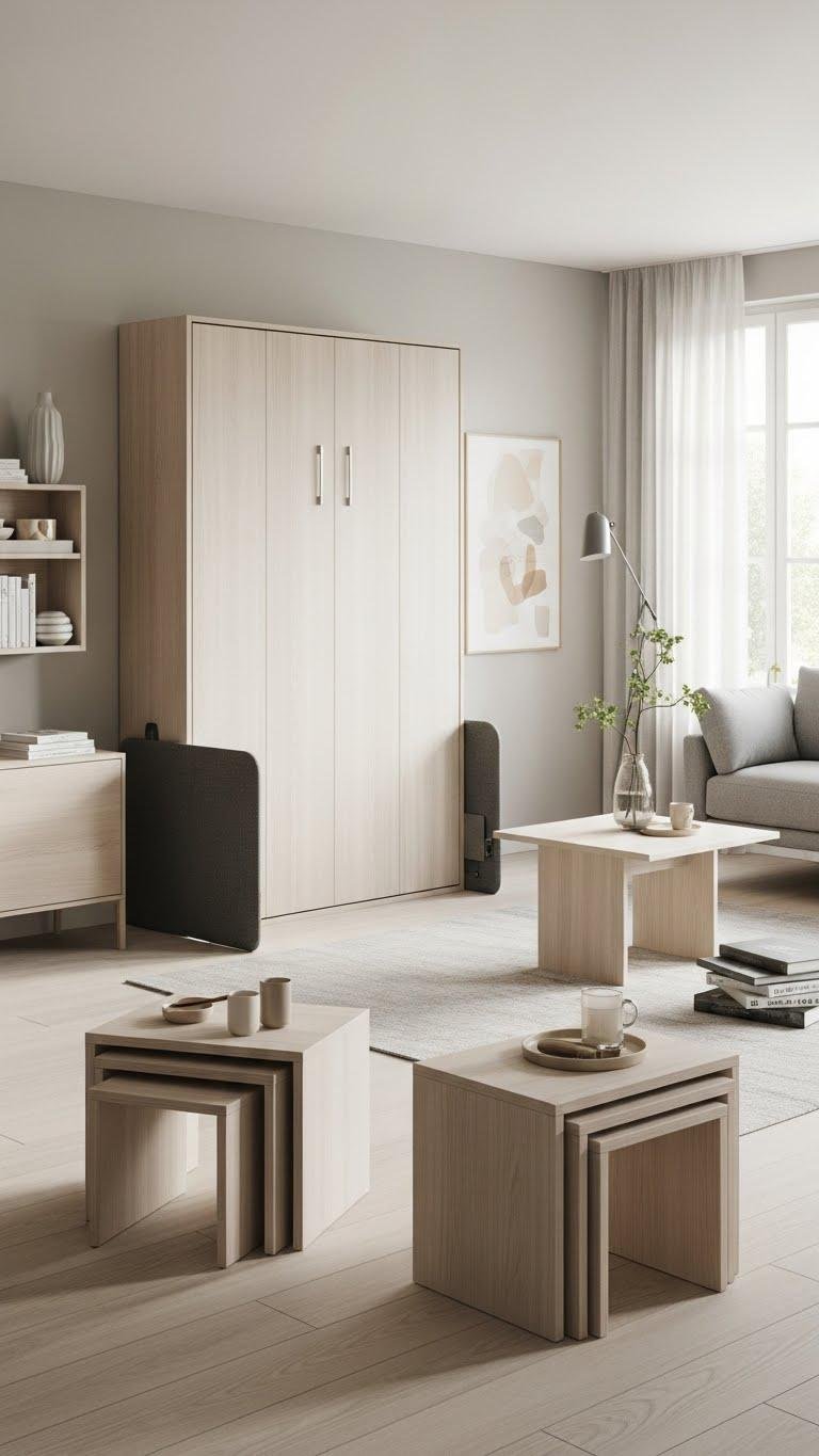 Think modular: choose convertible and foldaway pieces that adapt to how you live, so a single footprint serves multiple purposes without looking cluttered. Embrace wall beds for instant sleeping zones and sleek concealment. Pair nesting tables that stack and scatter as needed. Opt for clean lines, light finishes, and easy mechanisms so you can rearrange freely, keep surfaces clear, and enjoy flexible, uncluttered spaces.